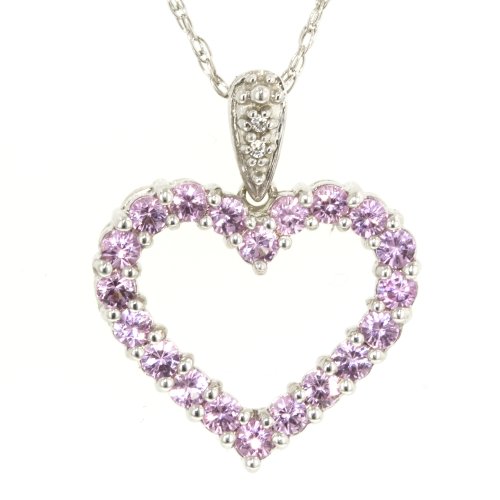 A wreath-like heart of created pink sapphire makes a beautiful adornment. This 10 karat white gold heart-shaped pendant showcases 20 faceted rounds of vibrant created pink sapphire, cradled in prong settings. The pendant is attached to a decorative bail, enhanced with two small genuine diamond accents (.01 cttw, I-J color, I3 clarity), and presents on a slender 18-inch white gold rope chain. Pink sapphire, a variety of the mineral corundum, is the lighter-hued sister of the ruby and a strikingly beautiful gemstone that projects confidence and femininity.