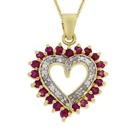 This heart pendant features 1 full carat of genuine ruby stones and 1/8 carat of round genuine diamonds. Crafted of 18k gold over sterling silver, the pendant dangles from an 18" rolo chain.