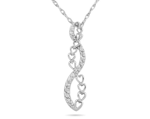 A fantastic heart journey pendnat featuring 16 sparkling white diamonds. An unique piece of jewelry that combines hearts and the ever popular journey style. 16 round diamonds weigh .16ctw, color I-J, clarity I1-I2, and gold weighs approximately 1.25 grams. the pendant hangs from a 18 inch gold plated silver chain.