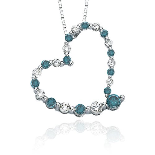 Fancy blue diamonds alternate with crisp white diamonds in this charming heart-shaped journey pendant. Made from polished 10 karat white gold, the pendant holds 23 graduated round diamonds (1/4 cttw), mounted in shared prong settings and arranged in an open heart shape. The heart hangs at an angle from a slender 18-inch box chain that threads through its top. With its graduated design, a journey pendant is meant to convey the continual growth of your love and your life experiences. This journey heart makes a beautiful anniversary or just-because gift.