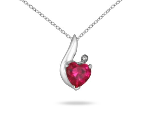 A magnificent combination of heart shape created ruby and diamond,creates a lovely pendant. This elegantly crafted ruby pendant, in platinum plated sterling silver, reveals a single diamond (0.01 total carat weight, I-J color, and I clarity) twinkling on top of the heart shaped synthetic ruby gemstone which is approximately 6mm in width. A sophisticated, yet simple pendant great fro casula and formal wear.
