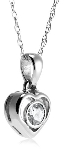 A sparkling round bezel-set diamond is framed by a petite polished heart in this charming pendant, fashioned from 10 karat white gold. The heart dangles from a polished single bale and is showcased on a delicate 10 karat white gold rope chain that fastens with a spring ring clasp. Dainty and feminine, this pendant makes a sweet any occasion gift.
