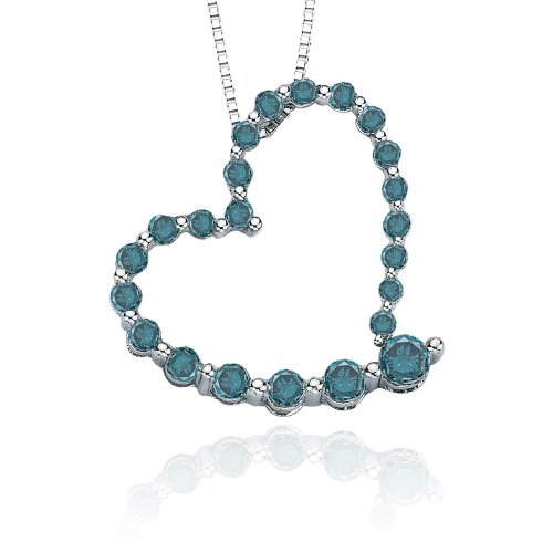 Fancy blue diamonds are a fashionable choice in this charming heart-shaped journey pendant. Made from polished 10 karat white gold, the pendant holds 23 graduated round blue diamonds (1/2 cttw), mounted in shared prong settings and arranged in an open heart shape. The heart hangs at an angle from a slender 18-inch box chain that threads through its top. Blue diamonds are associated with peaceful, harmonious relationships and with good health, making them a meaningful gift as well as a stylish one.