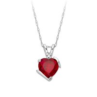 This beautiful pendant features a 7x7mm lab created heart shaped ruby with diamond accents set in 10kt. white gold. Complimentary chain included.