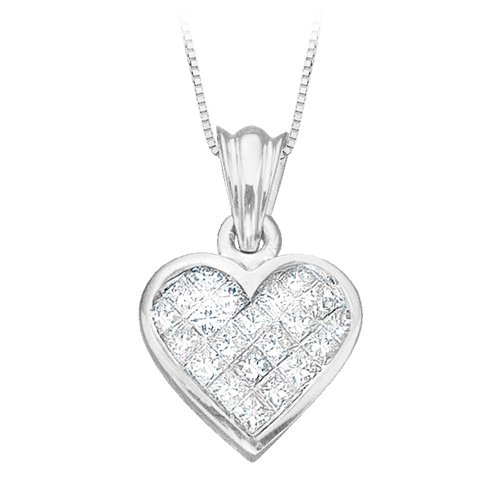 Romance sparkles from this distinctive heart pendant. A unique design adds an interesting twist to the traditional heart motif, with princess cut diamonds invisibly set in lustrous 14k white gold.