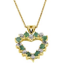 Once again, there is an issue with truth in advertisement. When offered a larger view, you are given a larger than life picture. Always make sure to look at the specifications for jewelry when you buy it! That is where they list the weight of the metal, quality of the gems, diamentions of the pendant, etc. When they say diamond "accents" they mean the left over chips after cutting a quality diamond. The total weight of diamonds in most of these products is usually somewhere in the neighborhood of 0.05 grams. Not much resale value. Also they will say, "Originally $60, marked down to $20!" Warning bells. When ordering on Amazon, you always get what you pay for. If you go cheap, you get cheap. Still, I've gotten good deals on pearls and other jewelry from Amazon. Just be careful. Look at reviews for the vendor! That is very important as well as customer reviews of the products. The picture of the pendant makes it look like it is set in solid gold (bevelled into a solid gold heart). Not the case, they are set individually, so if you look at the pendant sideways, you see tiny lines of gold and air. My wife was happy with it, even though the emeralds are dull, the diamond accents and gold setting helped. Plus, she's a good sport. It's the thought that counts. She does wear it from time to time.