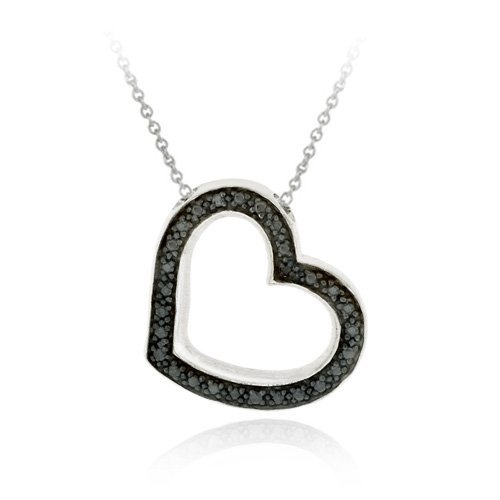 Enhance your look with a hint of a sparkle. This elegant open heart pendant features one black diamond and black rhodium coated pave pattern giving the imression of shimmering black stones. The pendant dangles gracefully from an 18" chain. The necklace is entirely crafted of sterling silver. Diamond weight is .01 carat